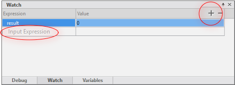 디버깅 모드로 애플리케이션을 실행합니다. 입력과 버튼 클릭이 이뤄지면 34번 줄에서 실행이 멈춥니다. 그럼 Watch 창을 선택한 후 + 버튼을 클릭하거나 마지막 행(Input Expression)을 더블 클릭하여 다음과 같이 result 변수를 등록합니다.