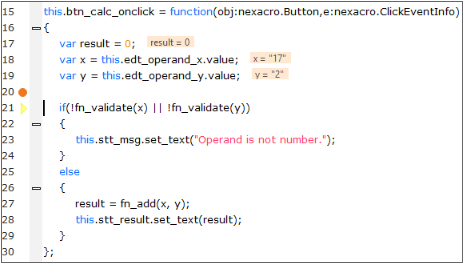 메뉴나 툴바에서 [Step Out]을 선택하면 3번 줄부터 fn_validate 함수의 끝인 5번 줄까지 실행한 후 fn_validate 함수를 호출했던 btn_calc_onclick 함수의 21번 줄로 이동합니다.