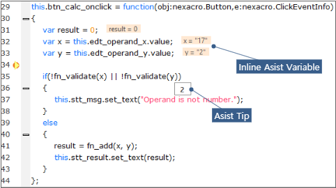 스크립트 편집기에서는 디버깅 중에 객체/변수값을 직관적으로 확인할 수 있도록 Assist Tip과 Inline Assist Variable 기능을 제공합니다.