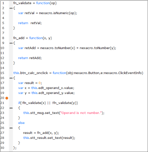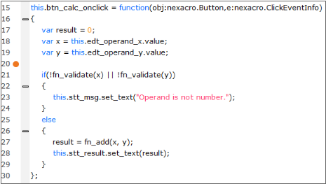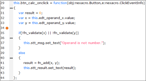 현재 위치인 fn_add 함수가 최상단에 위치하고 그다음으로 fn_add 함수를 호출한 btn_calc_onclick 함수가 위치합니다. 그리고 그 아래에도 여러 함수가 보이는데 이는 넥사크로 내부에서 사용되는 함수들이므로 특별한 경우가 아니면 신경을 쓰지 않아도 됩니다.