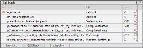 스크립트 함수 정의 형태에 따라 Call Stack 창에 함수명이 표시되지 않을 수도 있습니다. 예를 들면, 다음과 같이 선언된 함수는 함수명이 표시되지 않고 인수만 (a, b) 형태로 표시됩니다.
