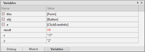 디버깅 모드로 애플리케이션을 실행합니다. 입력과 버튼 클릭이 이뤄지면 34번 줄에서 실행이 멈춥니다. 이때, Variables 창을 보면 다음과 같이 x, y, result 값을 확인할 수 있습니다.