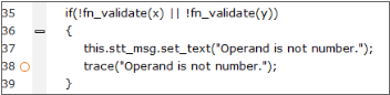 메뉴나 툴바에서 [Step Into]를 선택하면 아래와 같이 fn_validate 함수의 첫 번째 줄로 이동합니다. 만일 한 번 더 [Step Into]를 선택하면 3번 줄을 실행하는데 여기서 다시 isNumeric 함수의 호출이 발생하므로 isNumeric 함수의 첫 번째 줄로 이동하게 됩니다.