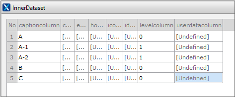 속성창에서 innerdataset 항목을 찾아 innerdataset 편집창을 실행합니다. 화면에 A, B, C 3개의 메뉴 항목을 표시하고 A 항목을 선택하면 A-1, A-2 2개의 메뉴 항목이 표시되도록 하겠습니다. innerdataset 편집창을 실행하면 입력할 항목이 많은데 이 중에서 captioncolumn, levelcolumn 2개 속성값만 지정합니다.