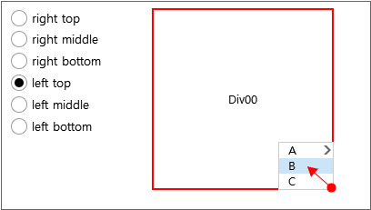 팝업 메뉴를 보여주는 좌표점에서 팝업 메뉴의 가로, 세로 정렬 방식을 지정합니다. default 값은 "right bottom"입니다. 이때 사용하는 방향은 좌표점을 기준으로 생각해야 합니다. 좌표점이 Div 컴포넌트의 오른쪽 아래 꼭지점이라면 default 정렬값을 적용해 해당 꼭지점 오른쪽 아래에 팝업 메뉴가 나타납니다. 반대로 정렬값을 "left top"이라고 설정한다면 아래 그림과 같이 Div 컴포넌트 안쪽에 팝업 메뉴가 나타납니다.