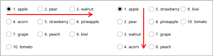 화면에서 아이템(데이터)이 표시되는 방향을 지정합니다. default 값은 "horizontal"입니다. direction 속성에 대한 오해 중 하나가 innerdataset을 설정하고 화면에 표시했을 때 세로 방향으로 데이터가 보이는데 왜 default 값은 "horizontal"이냐는 것입니다. 해당 속성의 정의가 Radio 컴포넌트의 방향이 아니라 아이템이 표시되는 방향을 지정하기 때문입니다. 아래 예제를 보면 좀 더 이해가 빠를 겁니다. columncount 속성값은 3이고 direction 속성값만 변경했습니다.