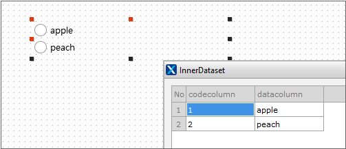 과일 목록을 출력하는 Radio 컴포넌트(fruit list)의 innerdataset 속성값은 각각 아래와 같습니다.