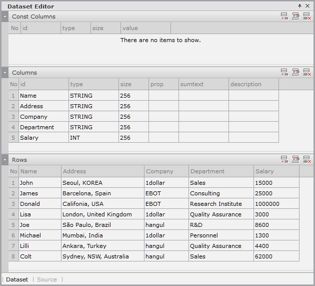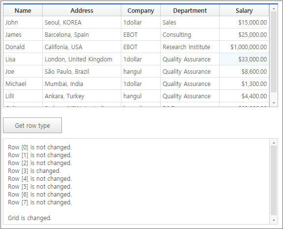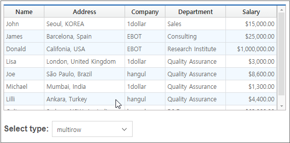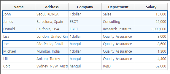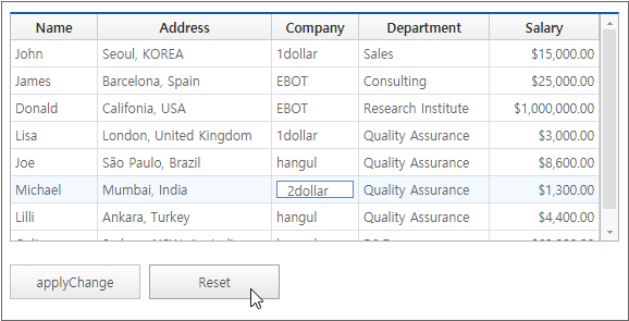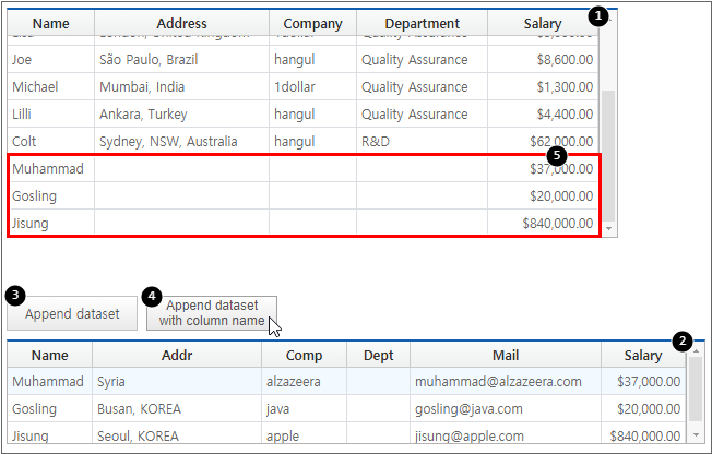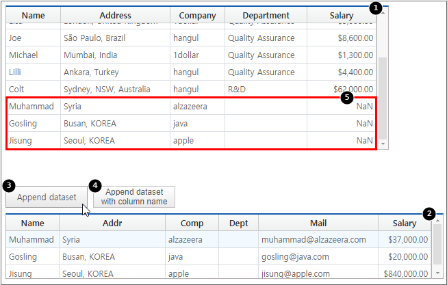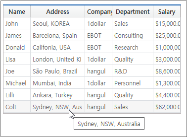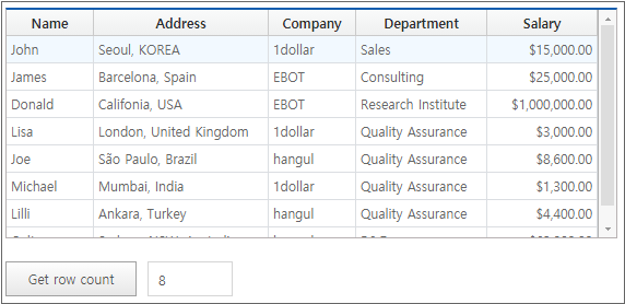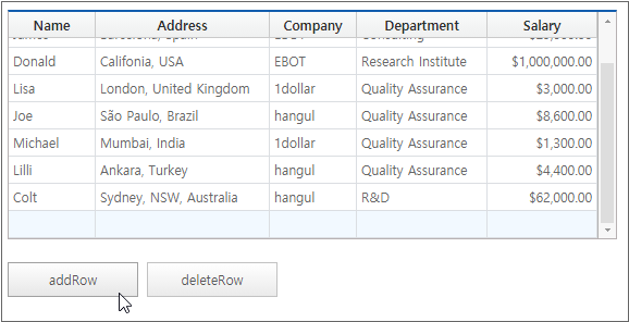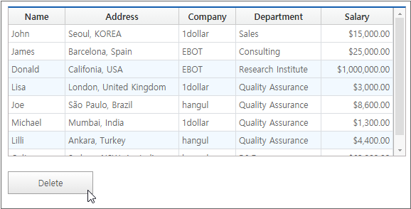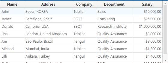 다음은 Grid 컴포넌트에 Name, Address, Company, Department, Salary 정보를 갖는 Dataset을 바인딩한 예입니다.