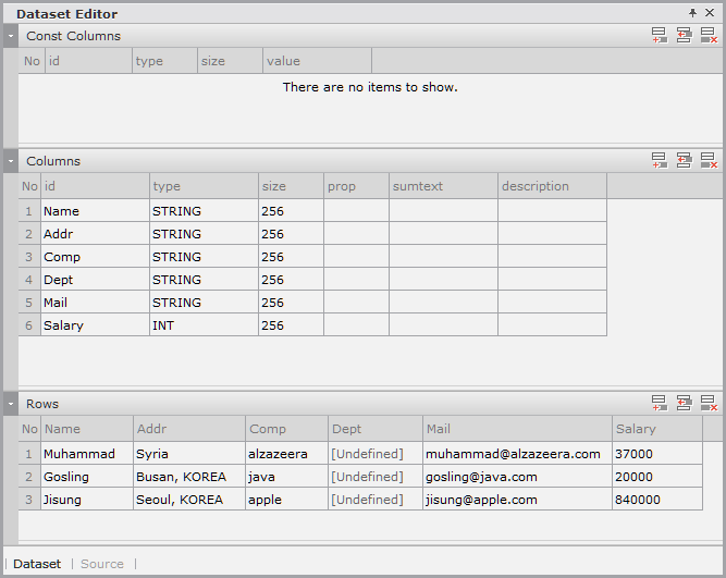 생성한 Dataset에 데이터 아이템 목록을 입력합니다. Invisible Objects 영역에 있는 Dataset00을 더블 클릭하면 Dataset 편집기가 뜨는데 칼럼과 로우를 아래 그림과 같이 입력합니다.