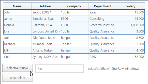 selectMultiRow 메소드는 기존에 선택되어 있던 영역이 유지된 상태에서 선택영역이 추가됩니다. 예를 들어 첫 번째 실행 시 선택 범위를 "0, 2"로 설정하고 두 번째 실행 시 "4, 5"로 설정한 경우에는 아래와 같이 선택된 상태가 표시됩니다.