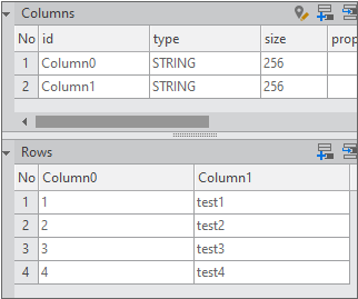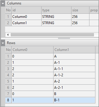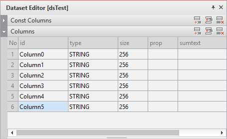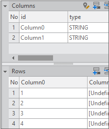 생성한 Dataset에 데이터를 입력합니다. Invisible Objects 영역에 있는 Dataset00을 더블 클릭하면 Dataset 편집기가 뜨는데 Columns과 Rows에 다음과 같이 입력합니다.