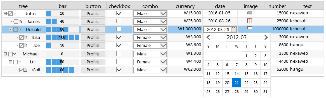 셀은 Grid를 구성하는 오브젝트중 하나로 Grid와 별도의 속성을 갖습니다. Dataset의 칼럼을 바인딩해 사용할 수도 있고, 셀의 displaytype, edittype 속성을 설정하면 Button, Combo, CheckBox, Image, ProgressBar, Edit 등의 컴포넌트 형태로 표현하거나 트리(tree) 형태로도 표현할 수 있습니다.