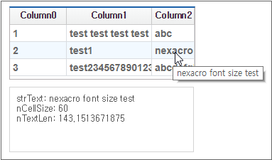 칼럼의 실제 너비보다 텍스트 길이가 큰 경우에만 툴팁을 표시합니다. 칼럼 너비와 텍스트 너비 정보를 TextArea 컴포넌트에 표시합니다.