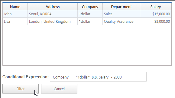 사용자는 조건 표현식을 입력하고 Filter 버튼을 눌러 Grid에서 필터링된 결과를 확인합니다. Cancel 버튼을 누르면 필터링이 제거되고 원본 데이터로 돌아갑니다.
