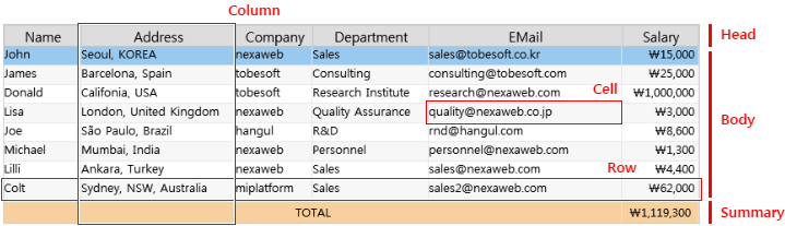 Grid는 head, body, summary라는 3개의 밴드(band) 영역으로 구성되며, 각 밴드는 셀(cell)이라는 기본 단위로 구성됩니다.