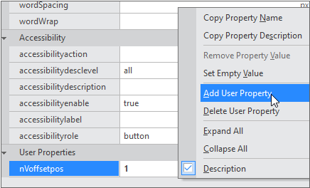 Button 컴포넌트에 User Property를 "nVoffsetpos"라는 이름으로 추가하고 각각 -1, 1 값을 설정합니다.