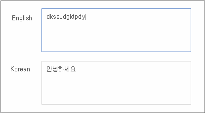 English라고 표시된 TextArea 컴포넌트에 영문을 입력하면 Korean 항목에 한글이 표시됩니다. 반대로 Korean 항목에 한글을 입력하면 English 항목에 영문이 표시됩니다.
