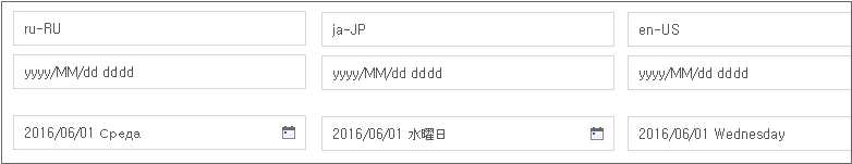 'LONGDATE', 'SHORTDATE'로 속성값을 지정하는 경우에는 locale 속성값에 따라 사전에 지정된 형식이 적용됩니다. 년도, 월, 일 항목을 배치하는 순서가 지역에 따라 달라집니다. 예제에서 locale 항목을 바꾸면서 어떻게 적용되는지 확인할 수 있습니다.