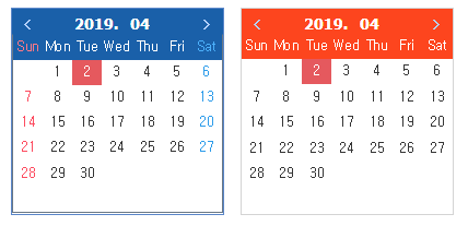 }기본 테마(blue)에서는 아래와 같이 설정되어 있습니다. 테마를 수정할 경우에는 DatePickerControl의 dayitem, weekitem으로 설정할 수 있습니다.