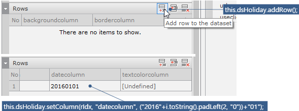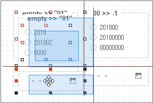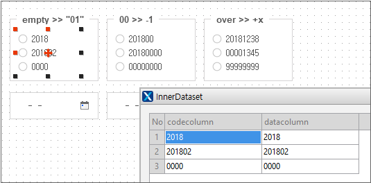 Calendar 컴포넌트의 type 속성값을 'monthonly'로 수정합니다. 컴포넌트의 height 값도 적절히 수정해주어야 합니다. width값과 같은 값으로 설정하면 보기 좋게 출력됩니다. Radio 컴포넌트는 innerdataset 값을 아래와 같이 설정합니다. 이때 false에 해당하는 codecolumn 값은 공백문자로 설정해야 합니다.