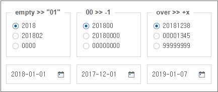 예제는 datepickerchangetype 속성값에 따른 동작과 값이 처리되는 방식을 이해하기 위한 예제이므로 운영하는 시스템에 적용 시 정상적으로 동작하지 않을 수 있습니다.