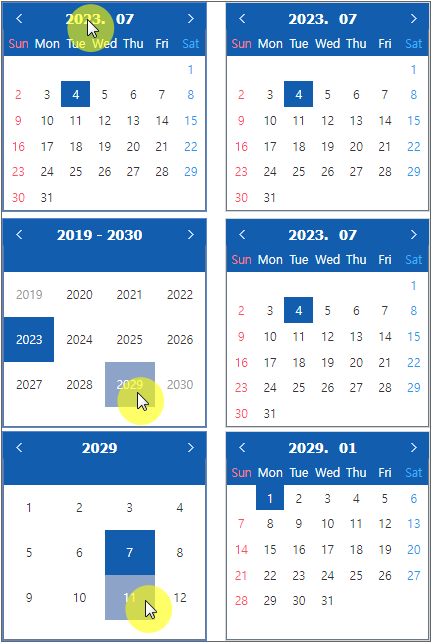 Calendar 컴포넌트에서 년, 월 항목 선택(클릭) 시 선택한 값을 처리해 줍니다.