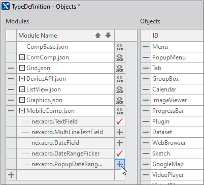 nexacro.PopupDateRangePicker 항목 옆에 [+] 아이콘을 클릭해 PopupDateRangePicker 컴포넌트를 Objects 목록에 추가합니다.