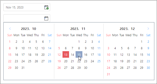DateRangePicker 컴포넌트는 1개 또는 2개(시작일자와 종료일자)의 날짜와 시간을 입력받거나 선택하기 위한 컴포넌트입니다. PopupDateRangePicker 컴포넌트는 DateRangePicker 컴포넌트와 유사하지만 팝업 형태로 동작합니다.