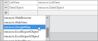 Objects 테이블에서 하단의 + 버튼을 클릭하여 목록에서 nexacro.GoogleMap을 선택합니다.