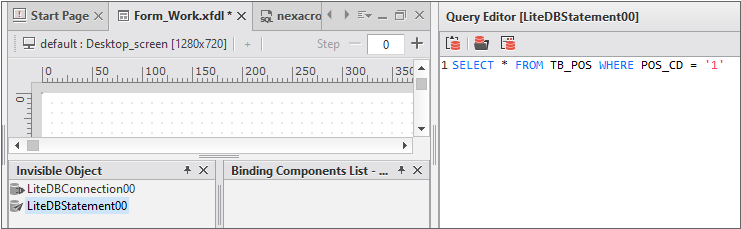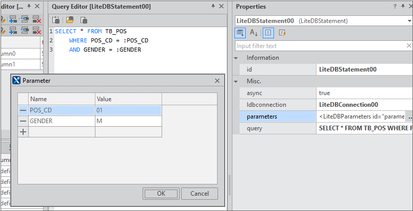 You can separately define parameters used for writing queries. Set the value of the parameters property as presented below. If you add a parameter in the format like :POS_CD to a query statement, the parameters defined by the parameters property will be used when the query is executed.