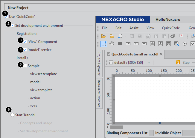 7 | Start Tutorial | Runs the QuickCode Tutorial Wizard. If you click the [Cancel] button in the QuickCode Tutorial Wizard, then you can create a project without the QuickCode setting. After creating the project, you can run QuickCode Tutorial Wizard from the menu [QuickCode > Let's Try QuickCode]. |