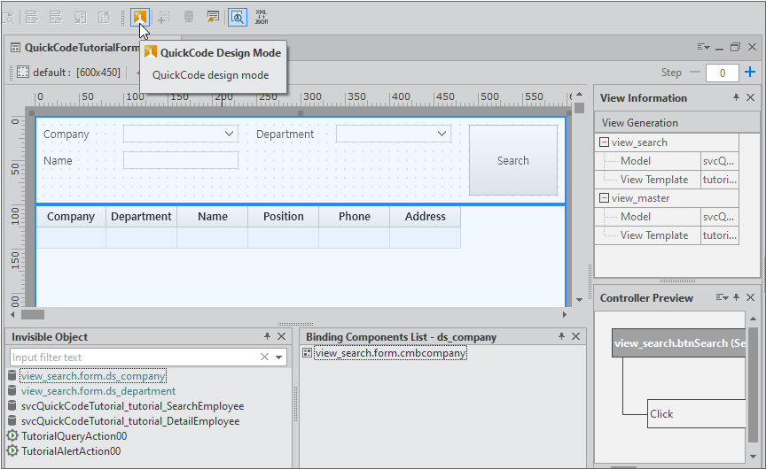 The entire screen consists of two views. View information can be checked by activating QuickCode Design Mode in the toolbar.