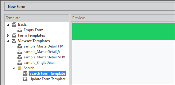 Select the ViewSet template under the Viewset Templates item on the Form Wizard screen. You can preview the configuration of the selected ViewSet template.