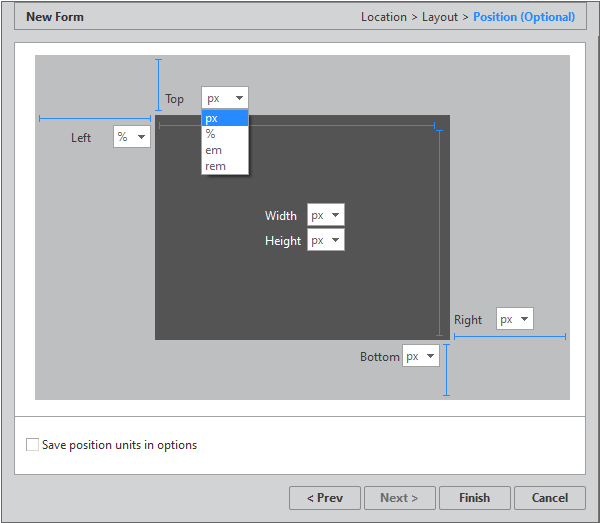 Set up the units for measuring the position when generating a component in a Form. The default is the value specified in options.