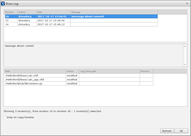 A window showing the information on a commit will be opened if you double-click the item or select Show Commit from the context menu.