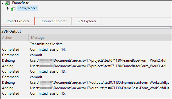 The above functions are also provided by the menu bar of Nexacro Studio. If you want to use Subversion through the menu bar, you need to access the View menu and activate the SVN Output and Check for Modification (Project) panes.
