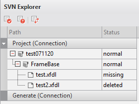 If you delete registered files in tools other than Nexacro Studio (e.g. Windows Explorer) and the deletion is not done with the SVN features, the statuses of those files will turn to "missing". In this case, those missing files can be restored with the Update function.