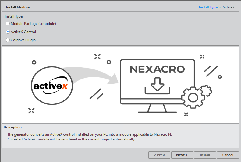 An ActiveX control can be installed like a module. You need to create a meta tag while you can see the properties, methods and events that are contained by a certain ActiveX control. To begin, access the menu [File > Install Module] and select "ActiveX Control" from Install Type.