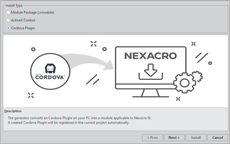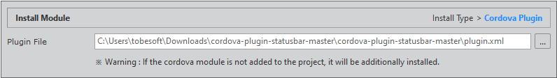 Select [File > Install Module] on the menu and select "Cordiva Plugin" from the Install Type field.