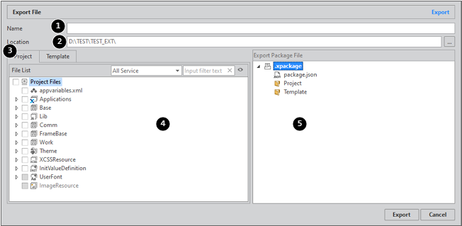 5 | Export Package File | Displays a list of files of templates in the project selected from the File List. |