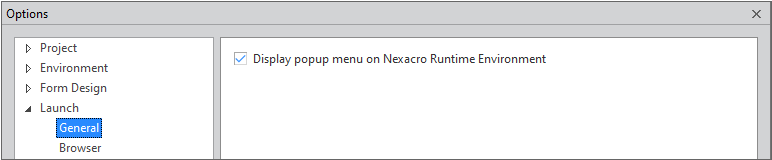 Display popup menu | Sets up whether to display the popup menu related to source in the launched Nexacro (NRE) |