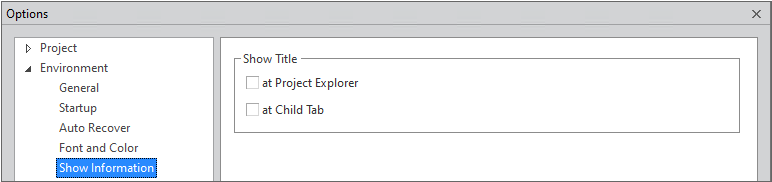 1 | Show Title | Controls whether to display title text: • at Project Explorer: Displays the title text information in FDL on Project Explorer • at Child Tab : Displays the title text information in FDL on the tab of the editing screen |