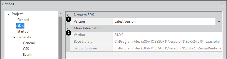 2 | More Information | Select ""User Setting"" under Version to edit the information. - Version: Select from the list of installed SDKs. - Base Library: Set the Base Library folder for the selected SDK. - Setup Runtime: Set the Setup Runtime folder for the selected SDK. |