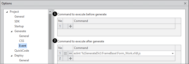 1 | ...before generate | Executes the specified command in the Command item before running Generate. |