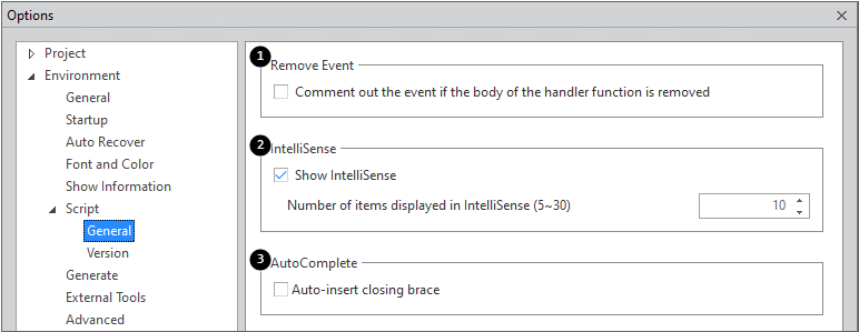 1 | Remove Event | Determines whether to comment out an event function when the relevant event is removed through the Properties pane |