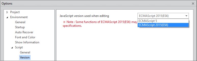 Select the JavaScript version to use when writing the script. Depending on the version selected, the items supported by Script IntelliSense will change, and the script verification rules are applied differently for Generate.