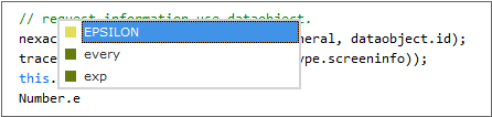 This is the IntelliSense screen displayed when "ECMAScript 2015(ES6)" is selected as the Version option and "Number.e" is entered in the script edit window. The "Number.EPSILON" property, which is supported from ES6, is additionally displayed.