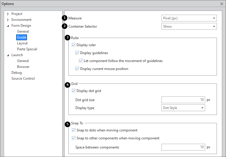 5 | Snap to dots when moving Component | When checked, the magnetic function will be enabled and will align controls with dots when moving them on the canvas |