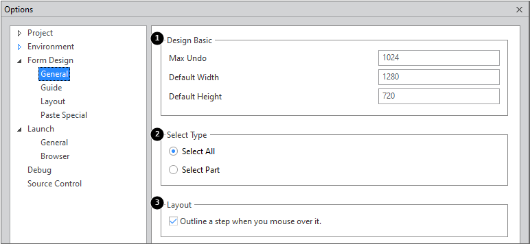 Configures general options for Form Design.
