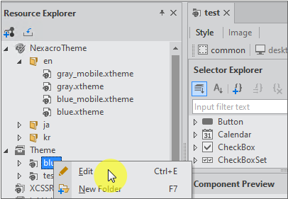 Theme 편집기는 Resource Explorer에서 "Theme" 항목 아래에 표시되는 테마를 더블클릭하거나 컨텍스트 메뉴에서 [Edit]를 선택해 열 수 있습니다.